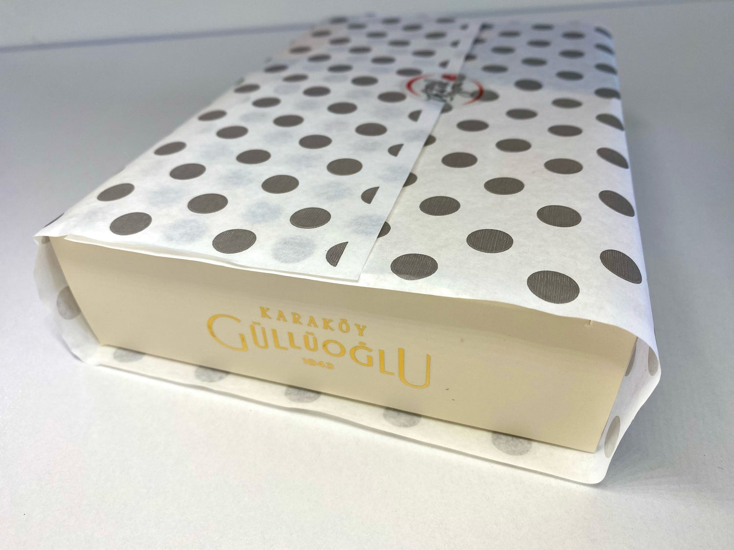 Karakoy Gulluoglu presenteert hun heerlijke versie van Pistachepasta baklava. Het is handgemaakt met fijn gemalen pistache, poedersuiker, water, en vervolgens gemengd om de perfecte textuur te creëren voordat het wordt gebakken. Pistachepasta wordt vaak genoten met cake, zoetwaren, of zelfs op zichzelf met een kopje koffie of thee. Wat je voorkeur ook is, maak je klaar om je smaakpapillen een zalige ontwaking te laten ervaren met dit zoete, nootachtige dessert.