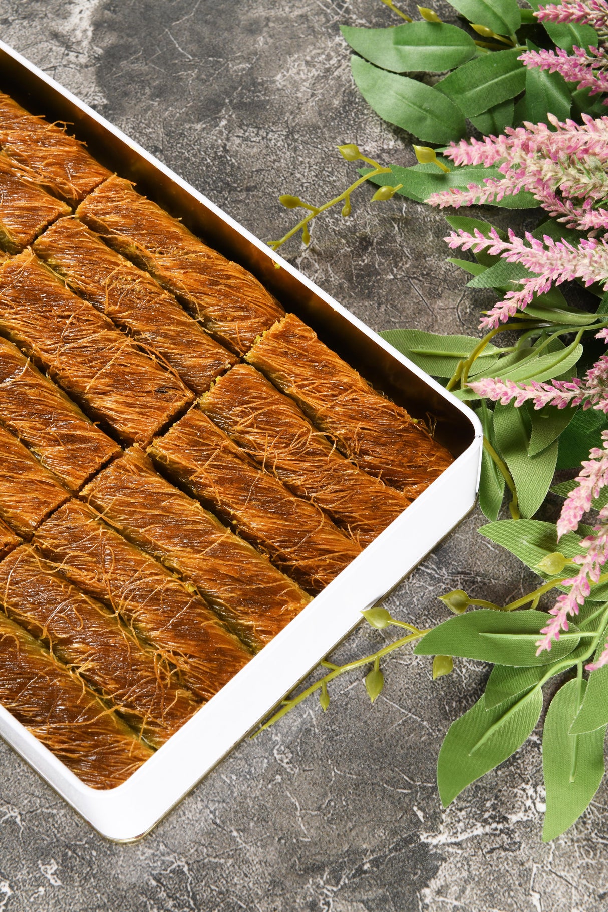 Ingrediënten (allergenenwaarschuwing): Speciale bloem voor kadayif, geklaarde boter (platte olie), zonnebloemolie, drinkwater, zout, kristalsuiker, citroensap en pistachenoten (grijs-groene pistachenoten).