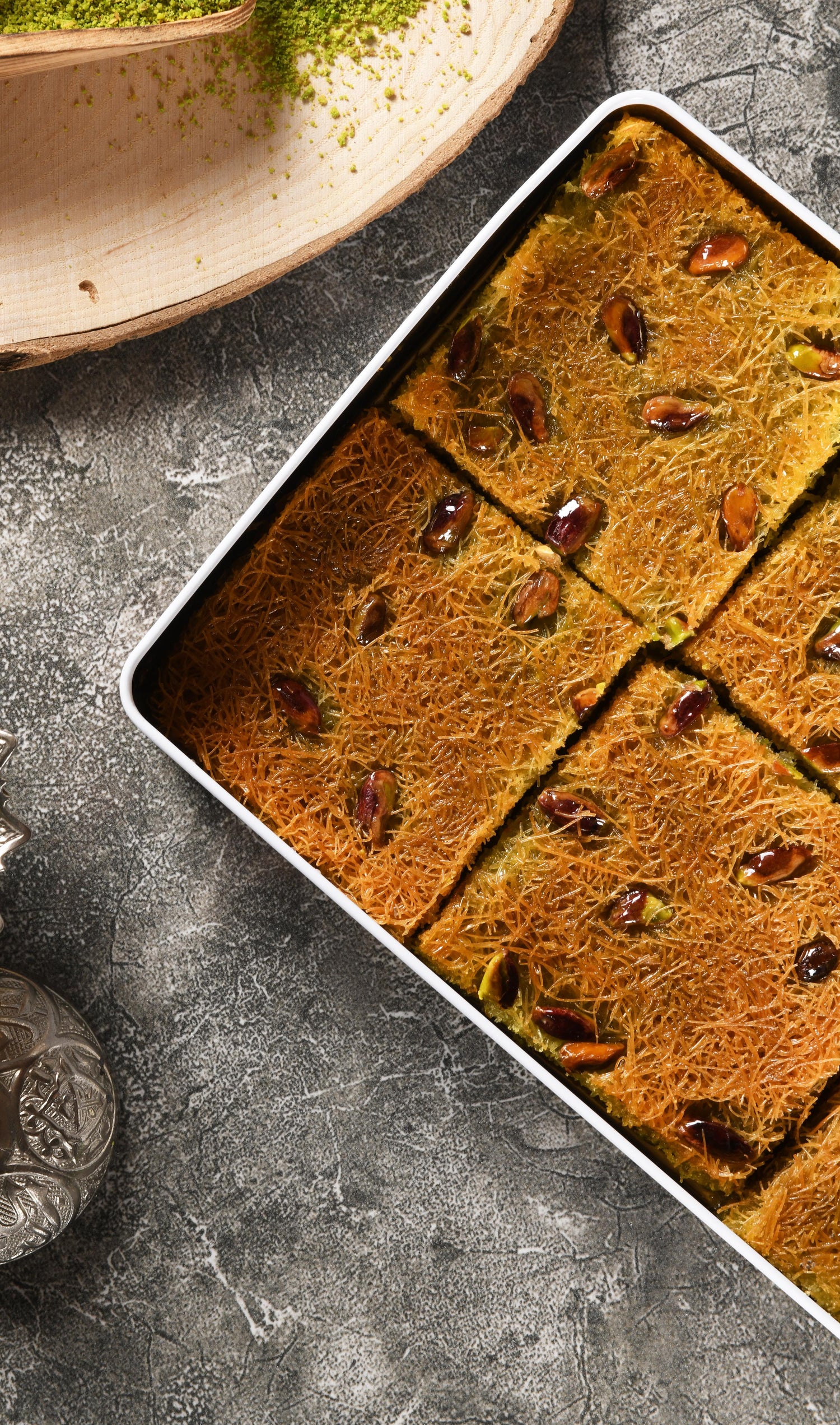 Ingrediënten (Allergenenwaarschuwing): Onze Pistache Kadayif wordt gemaakt met speciale bloem voor kadayif, pure boter, zonnebloemolie, vers drinkwater, een snufje zout, kristalsuiker, een vleugje citroensap en premium pistachenoten uit de regio.