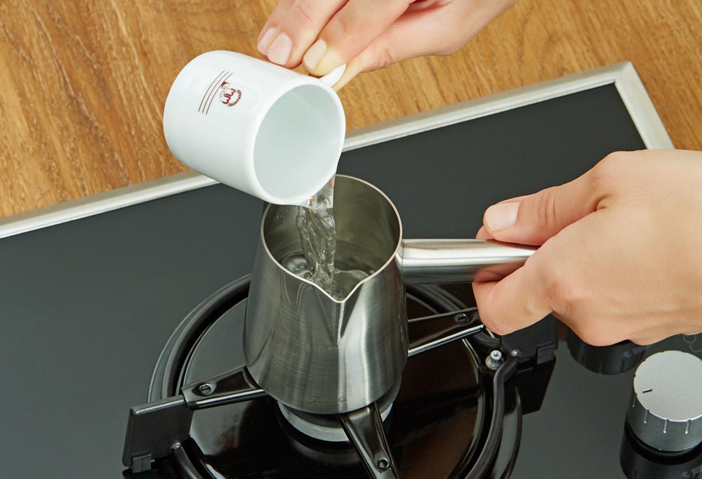 Gebruik 5-6 gram (1,5 theelepels) koffie per 65 ml water. Voeg het water toe aan een pot en zet deze op laag vuur. Voeg de koffie en de door jou gekozen hoeveelheid suiker toe aan het water en roer langzaam. Zodra de koffie begint na verloop van tijd te borrelen, serveer het schuim in je kopje(s). Kook daarna de resterende koffie nog wat door en giet de rest in je kopje(s).