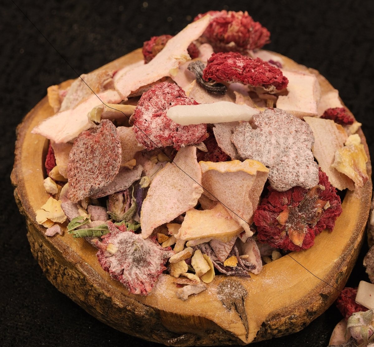 Apple, Strawberry, Mango, Pineapple, Coconut, Date, Pomegranate, Jasmine Flower and Natural Blackberry Powder